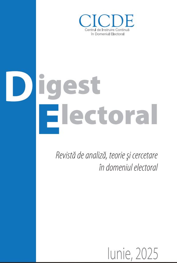 Revista „Digest electoral” a fost elaborată ca o sursă informativă pentru cei interesați de alegeri, oferindu-le posibilitatea de a lua cunoștință de ultimele reglementări în domeniu, de practicile inovative, precum și de istoricul și aplicabilitatea votului. Totodată, revista este concepută sub forma unei platforme de exprimare a informațiilor electorale prin intermediul articolelor de specialitate științifico-practice pentru cercetători. Revista a fost fondată în anul 2017 de Centrul de Instruire Continuă în Domeniul Electoral (CICDE), fiind o publicație bianuală de analiză, teorie și cercetare electorală, iar în anul 2019 a fost înregistrată la Camera Națională a Cărții din Republica Moldova. În acest număr examinăm procesul de ajustare a legislației electorale și a celei conexe la legislația Uniunii Europene, asistența acordată Republicii Moldova de Consiliul Europei pentru susținerea calității procesului electoral democratic, precum și aspectele teoretice și practice ale multipartidismului ca bază pentru reprezentarea diversității și a opțiunilor minorităților naționale în statul democratic. Revista prezintă sumarul unor prezentări din cadrul Conferinței științifice anuale CICDE „Spre o democrație calitativă prin cercetare electorală” din 15 noiembrie 2024 și studii elaborate de organizații specializate, care pot să fie consultate integral online, pe portalurile acestor organizații. În această ediție prezentăm - Angajamente model pentru promovarea alegerilor autentice și credibile - elaborate de organizații internaționale de frunte care susțin dezvoltarea democrației: IDEA, The Charter Center, NDI, IFES, Kofi Annan Foundation. Angajamentele-model vin să sprijine eforturile separate ale statelor și ale actorilor electorali pentru a consolida integritatea electorală. De asemenea atragem atenția cititorilor asupra fenomenului observării false a alegerilor, publicând extrase din sumarele publicațiilor EPDE – Platforma Europeană pentru Alegeri Democratice, despre acest fel de manipulare utilizat de regimurile autoritare pentru ași da legimitate. Revista „Digest electoral” își deschide paginile sale tuturor celor interesați să contribuie la dezvoltarea domeniului electoral prin studii, analize și cercetări valoroase și reprezentative din țară și străinătate. Suntem în așteptarea articolelor științifice originale care nu au fost publicate în alte reviste științifice sau în volumele conferințelor științifice.